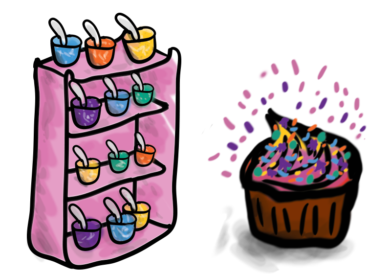Temel malzemeler ve topping süprizleri bizde, seçimler sizin. Yüzlerce farklı cupcake yapabilirsiniz, canınız çekerse müsli de!